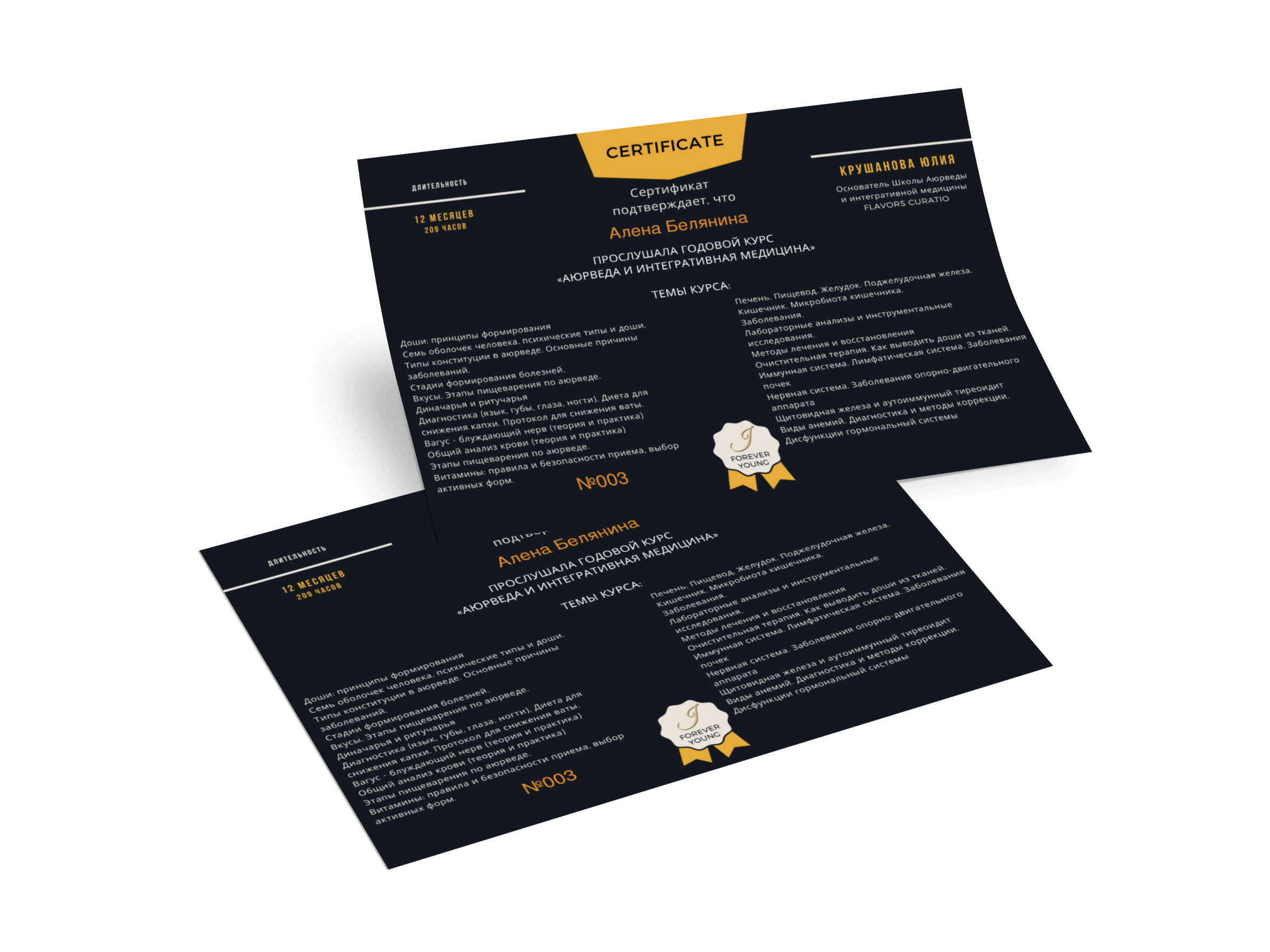 Лица, имеющие среднее профессиональное и(или) высшее образование, по окончании 3-ей ступени (18 месяцев обучения) тарифа «Профессиональный» авторского курса Юлии Крушановой «Аюрведа и интегративная нутрициология» и после успешной сдачи выпускной работы получают диплом установленного образца о профессиональной переподготовке с квалификацией «Специалист Аюрведы и интегративной нутрициологии»